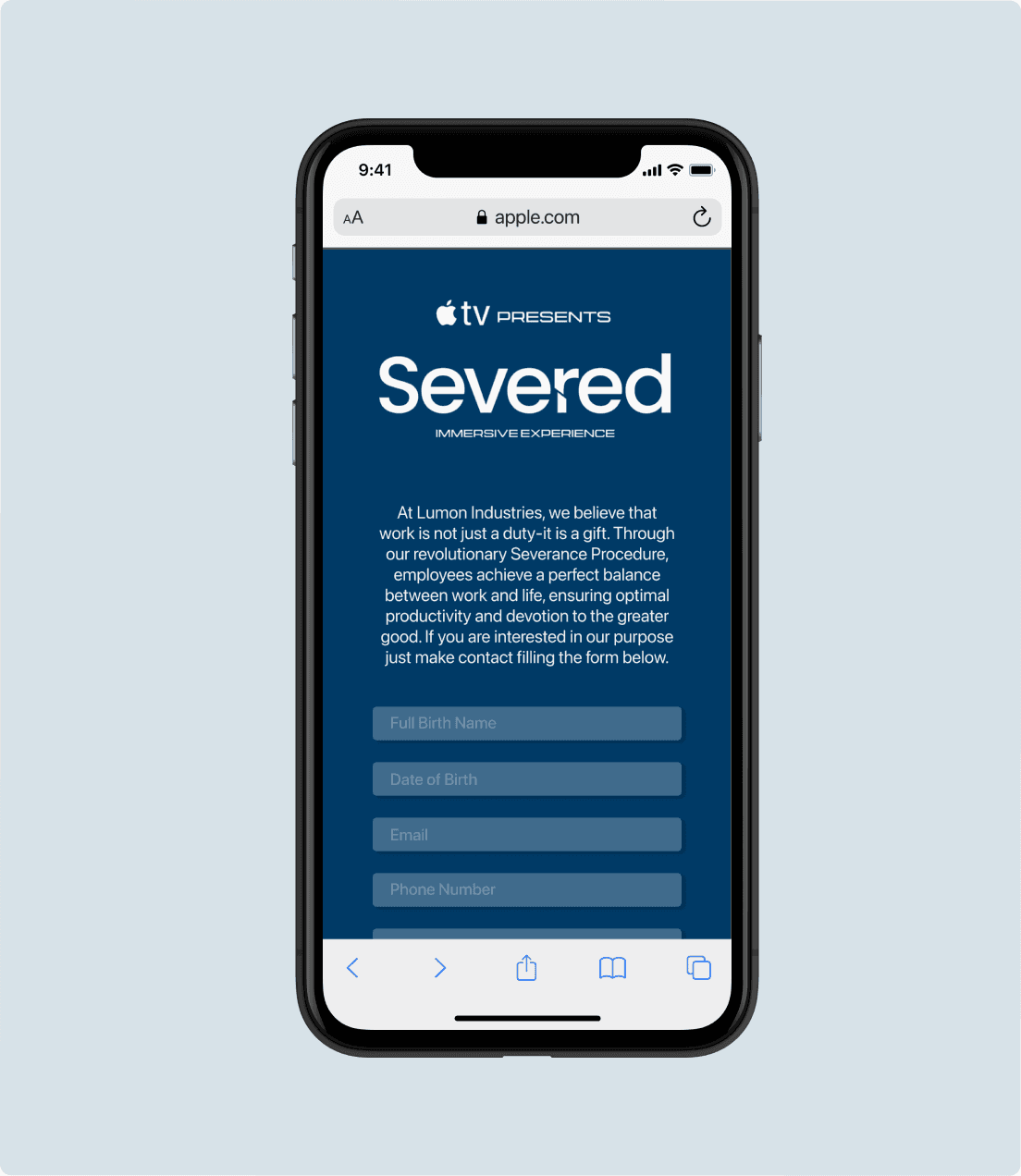 Apple and Apple TV have always cultivated a reputation of creating innovate content and campaigns. Integrating Apple’s strong brand of simple innovation and emotional storytelling while reflecting each series story, message, vibe and aesthetics. Fully immersive expierence integrating compenents from immersive theater shows like Sleep No More and Life & Trust. The Severed experience is more than immersive—it’s intentionally disorienting. Visitors don’t just explore the Severed Floor—they become part of its confusion. Through fragmented scenes, restricted access, and conflicting truths, we mirror the fundamental question of Severance